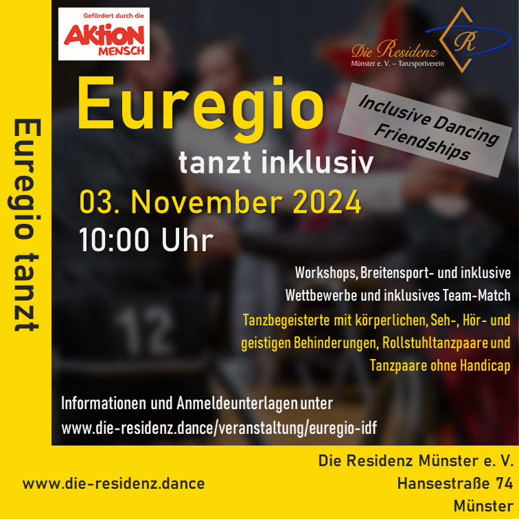 Die Residenz Münster e.V. lädt 2024 alle Tanzbegeisterten zum inklusiven Tanzfest „Inclusive Dancing Friendships“ (Euregio tanzt inklusiv) nach Münster ein. In Zusammenarbeit mit dem Tanzsportverband Nordrhein-Westfalen und dem Niederländischen Rollstuhltanzverband (SRN) erwarten wir Gäste aus den Niederlanden und Deutschland.