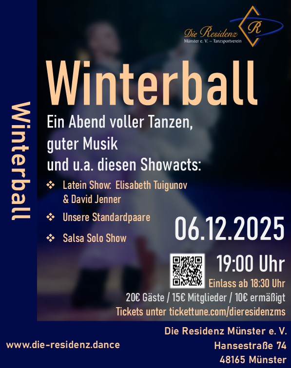 Ein ganzer Abend voller Tanzen: Am 06. Dezember laden wir zur zweiten Auflage unseres Winterballs ein. Genießen Sie in unseren Räumen einen tollen Ballabend bei winterlich-bezaubernder Atmosphäre, einem abwechslungsreichen Programm und natürlich vielen Gelegenheiten zum Tanzen. Sie dürfen sich freuen auf einen Auftritt einiger unserer Standardpaare, eine Salsa Solo Show von Tänzerinnen und Tänzern des Hochschulsport Münster sowie eine Show unseres Ausnahmepaars Elisabeth Tuigunov und David Jenner.