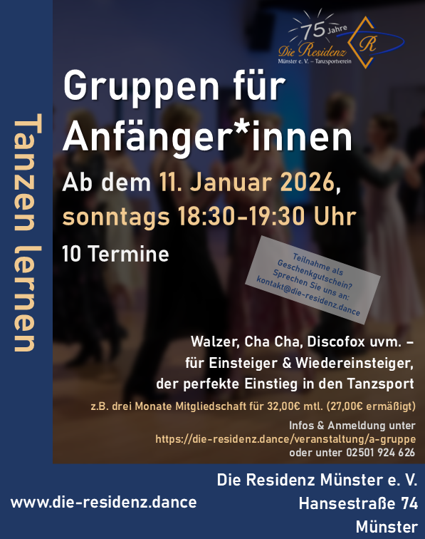 Zu Beginn des Jahres startet wieder eine neue Anfänger*innengruppe in der Residenz, die sich an Menschen mit wenigen bis geringen Vorkenntnissen richtet. Ob Cha-Cha, Walzer oder Discofox, bei unsererem Trainer Dirk lernen Sie alles, was am Anfang wichtig ist.
