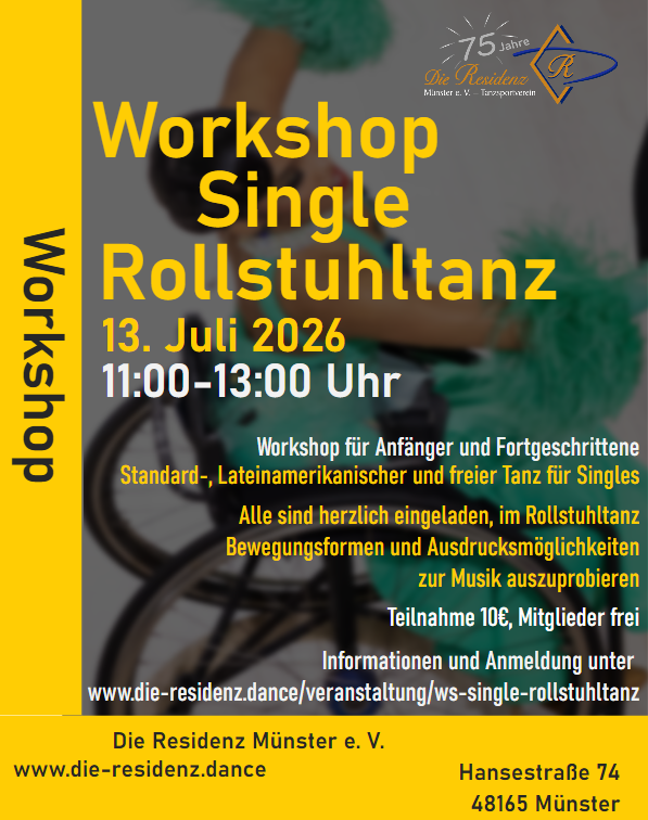 Die Residenz Münster e.V. lädt 2026 alle Tanzbegeisterten zum inklusiven Tanzfest „Inclusive Dancing Friendships“ nach Münster ein. In Zusammenarbeit mit dem Tanzsportverband Nordrhein-Westfalen und dem Niederländischen Rollstuhltanzverband (SRN) erwarten wir Gäste aus den Niederlanden und Deutschland.