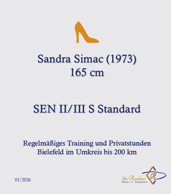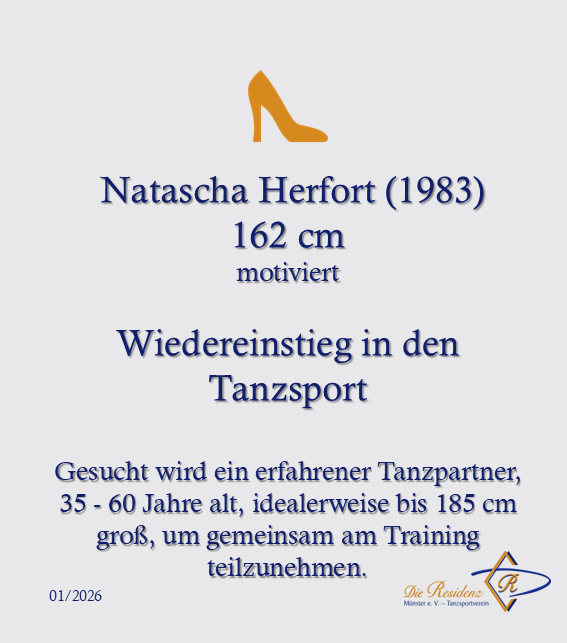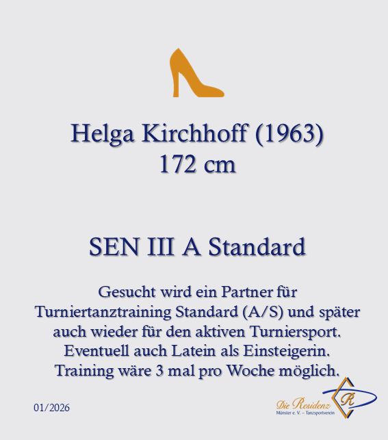 Damit dein Gesuch seinen Weg auf die Website findet, sende uns einfach eine Mail an kontakt@die-residenz.dance und teile uns deinen Name, deine Körpergröße, sowie das Niveau, für das Du einen Tanzpartner suchst, mit. Das Niveau kann zum Beispiel bedeuten: Breitensport, Turniervorbereitung Standard oder Latein oder auch eine bestimmte Turnierstartklasse, wenn du schon länger im Tanzsport aktiv bist. Bei Ambitionen gib gerne an, wie häufig du pro Woche trainieren möchtest.