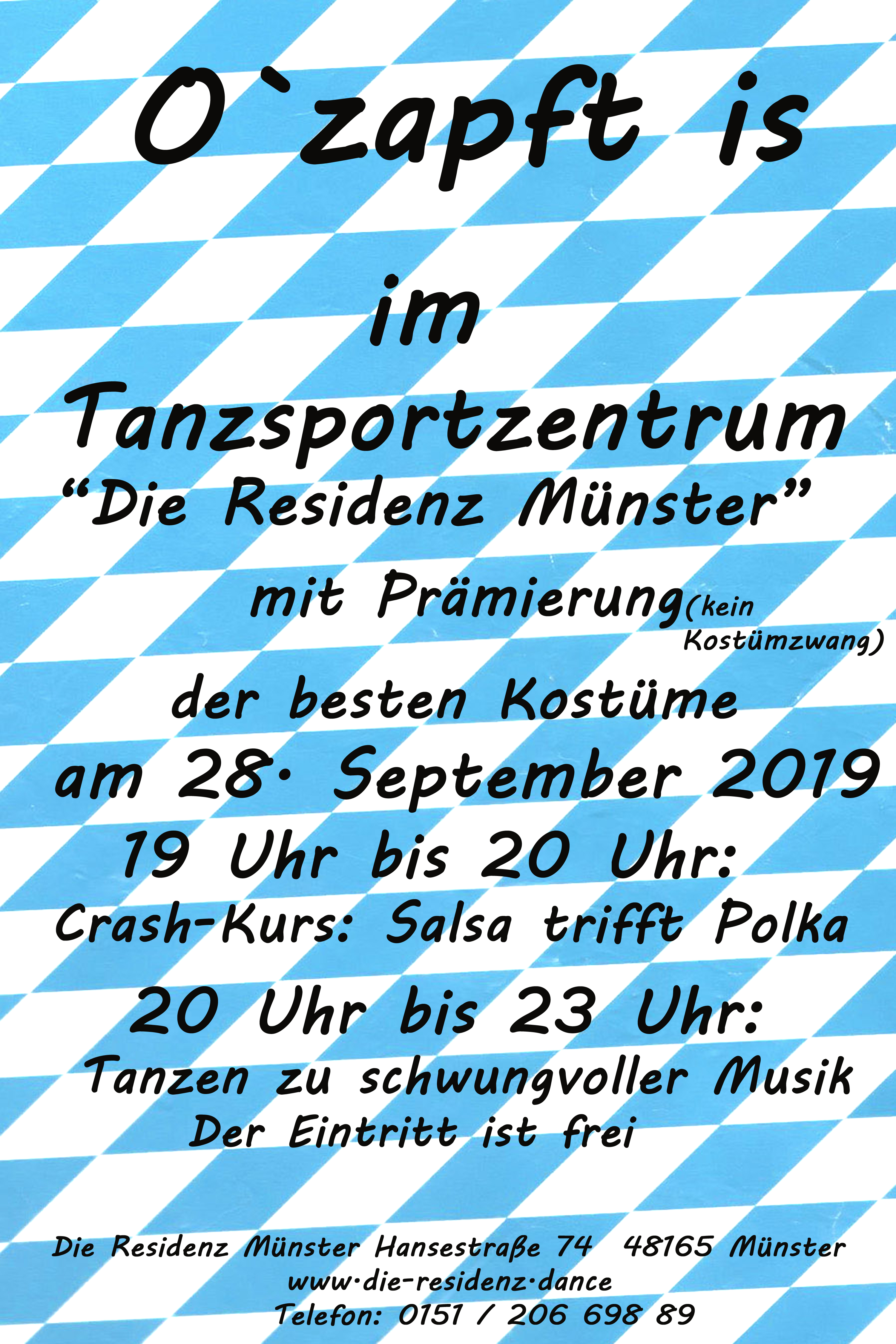 Liebe Mitglieder, liebe Gäste! O ́zapft is... ... auch in diesem Jahr wieder im Tanzsportzentrum „ Die Residenz“ Hansestraße 74, 48165 Münster.