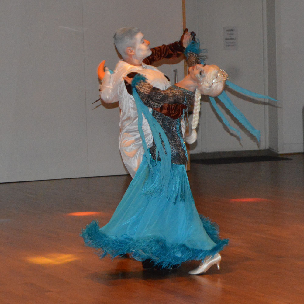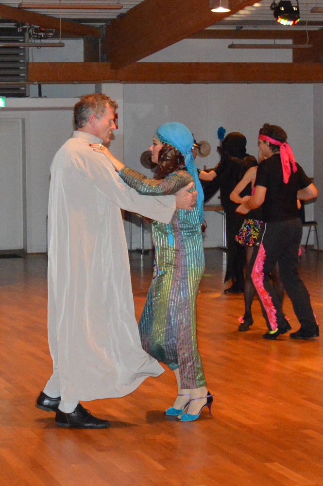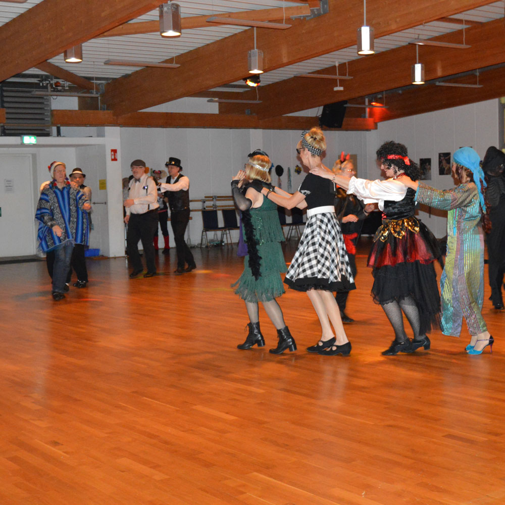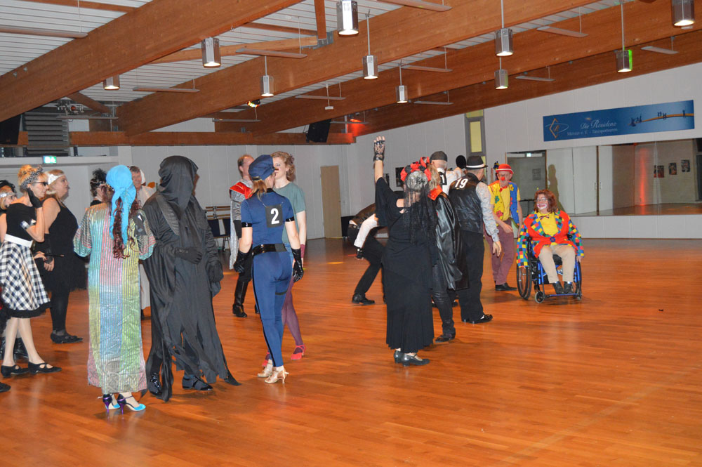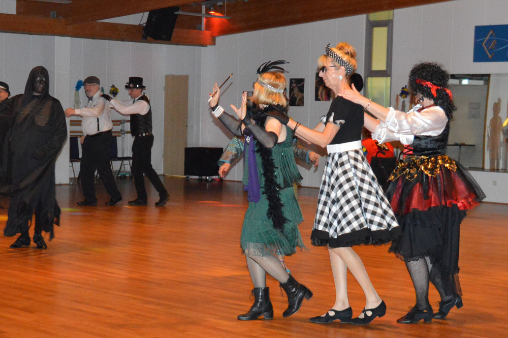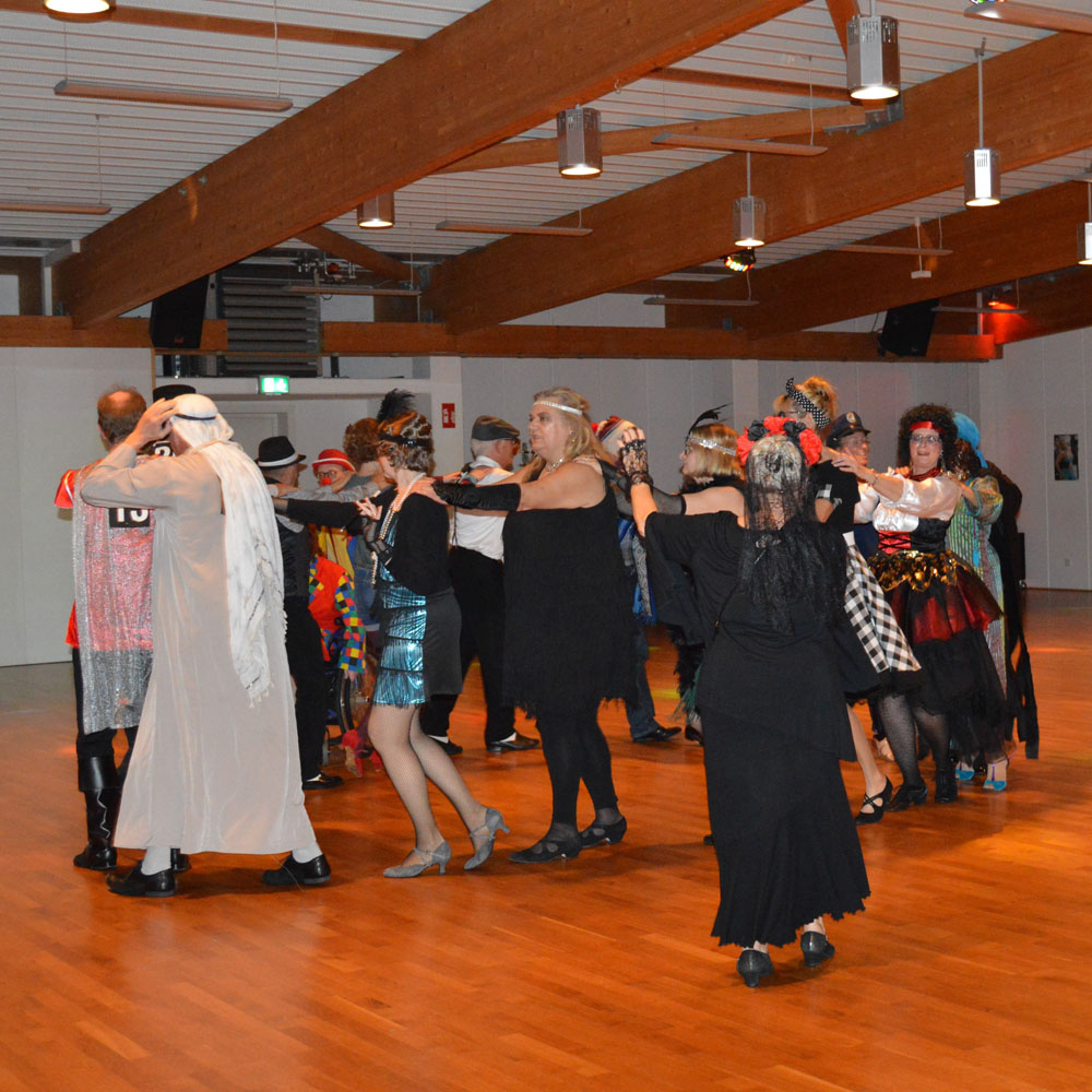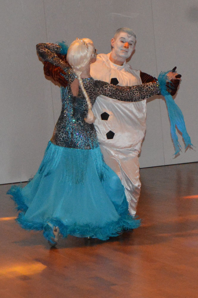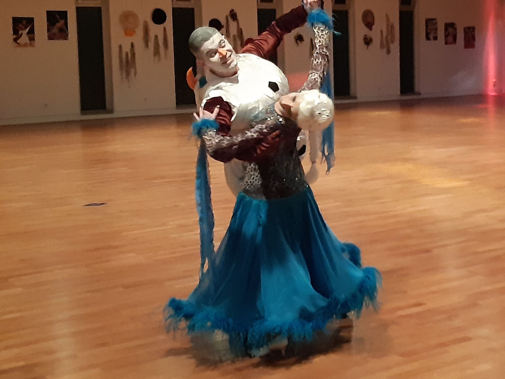 Nicht nur der bunt geschmückte Saal, die toll kostümierten Thekenhelfer, die vielen einfallsreichen Karnevalskostüme boten ein buntes Bild. Auch das Programm war eine bunte Mischung. Mit LindyHop - dem Tanz, der gute Laune bringt - beschäftigten sich viele Mitglieder und Gäste im Crash- Kurs. Für die meisten Tänzer*innen war diese lockere Tanzart eine neue Erfahrung, auf die sie sich gerne einließen. Als Follower oder Leader, mit Bounce und Drehungen, Partnerwechsel und "kreativem" Break hatten alle viel Spass! Auch die sich anschließende Musikvielfalt, ein Mix aus karnevals- Latein- und Standardmusik, sorgte für bewegte Stunden auf dem Parkett, auch beim Mitmachtanz, angeleitet von Moni Pietig. Bei der Kostümprämierung hatten die Juroren die " Qual der Wahl" , den Einfallsreichtum der Gäste zu bewerten. Als tänzerischer Höhepunkt des Abends zeigte das Residenz - S-Klassen Turnierpaar Monika und Markus Scheffler - als Eisprinzessin Elsa und " Frozen Olaf" - in entsprechend toller Kostümierung die 5 Standardtänze einmal anders. Ein Hochgenuss, für den mit lange anhaltendem Beifall gedankt wurde.