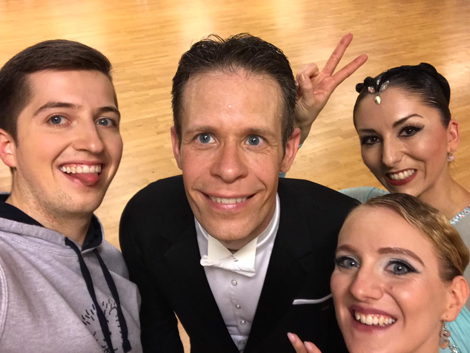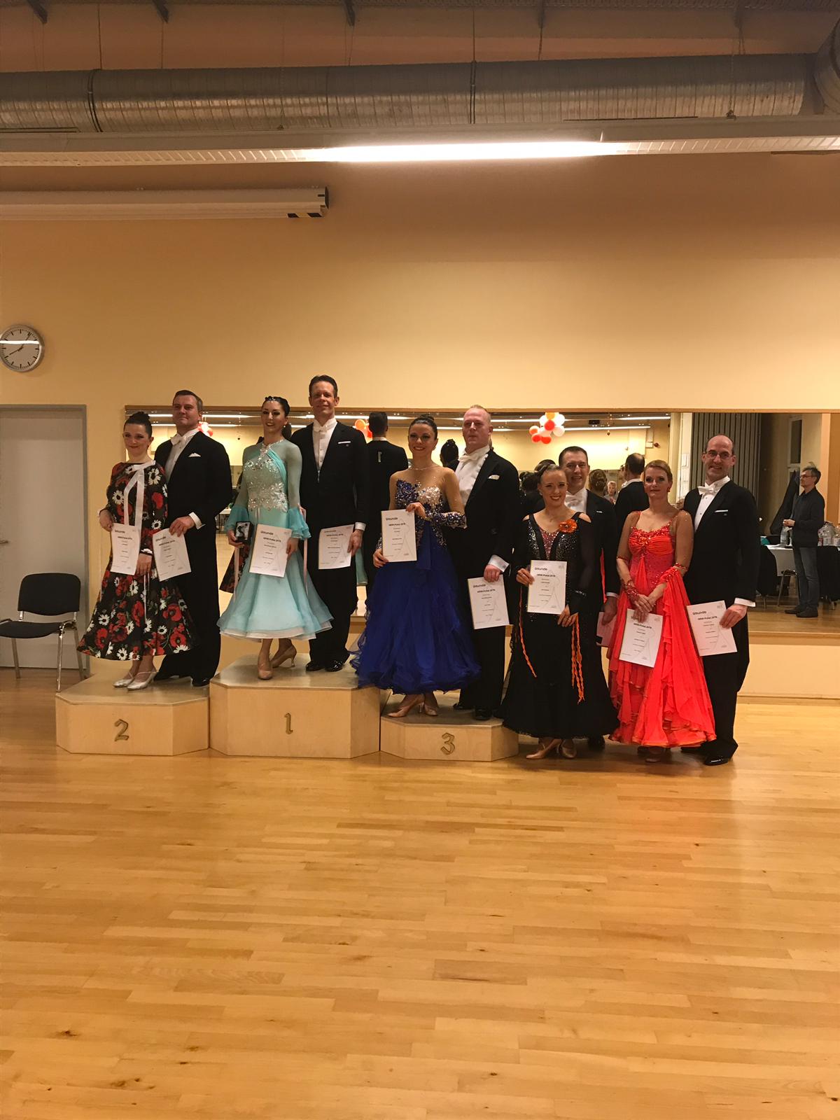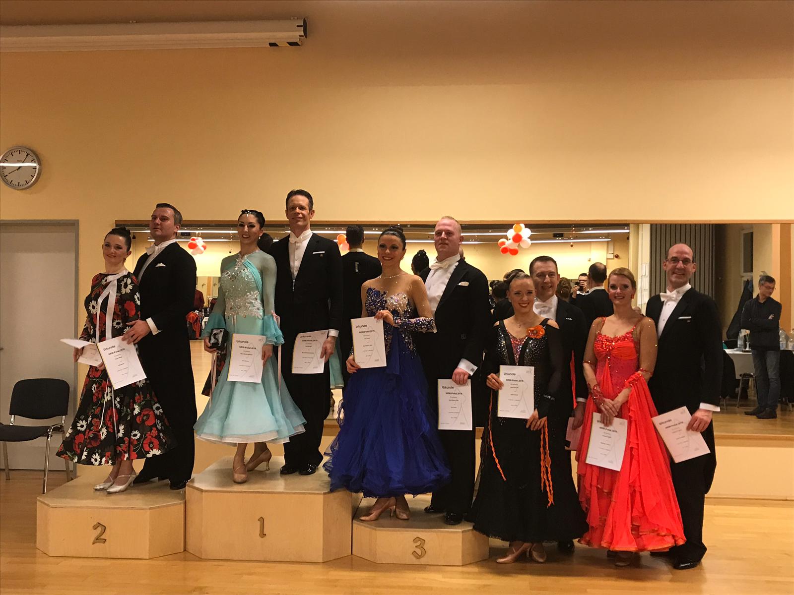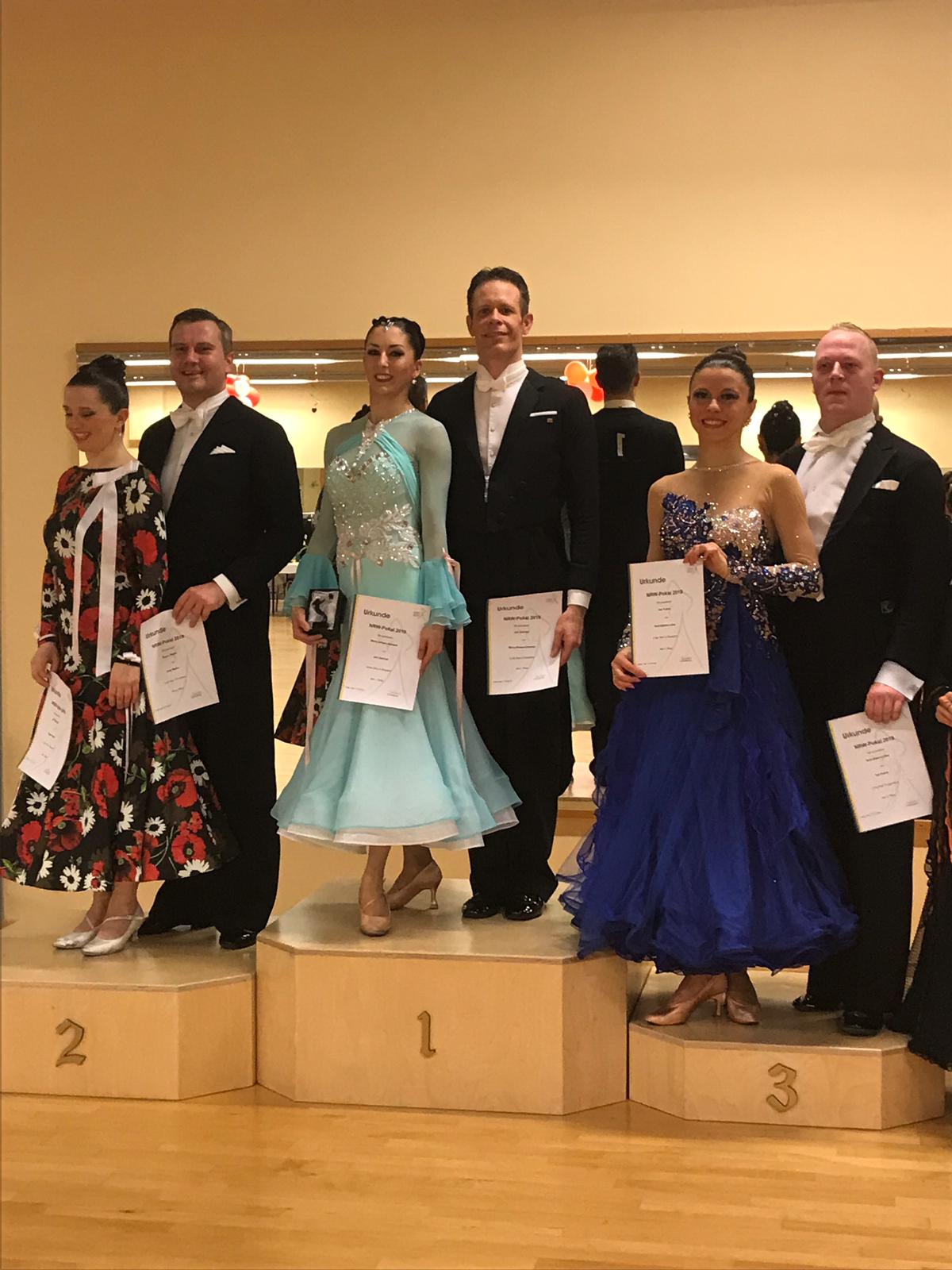 Ebenfalls an den Start gingen Jan Zaminer und Muna Brisam-Zaminer. Getragen vom Applaus der noch gebliebenen Residenzler siegten sie mit 24 von 25 möglichen Einsen in einem Feld von 5 Paaren und stiegen in die Sen-I-S-Klasse auf. Somit sind sie startberechtigt zur Teilnahme an der Weltmeisterschaft 10 Tänze, die im Sommer in Ungarn stattfindet.