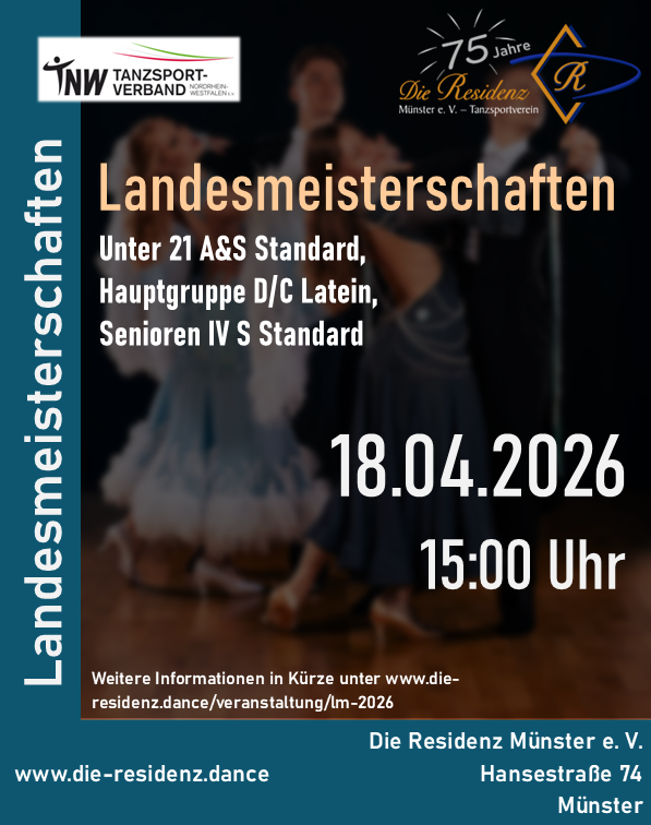 Wir freuen uns sehr, am 18. April die Landesmeisterschaften NRW in den Klassen Unter 21 A&S Standard, Hauptgruppe D/C Latein und Senioren IV S Standard ausrichten zu dürfen.