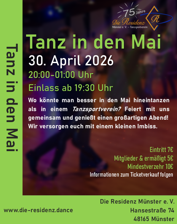 Wo könnte man besser in den Mai hineintanzen als in einem Tanzsportverein? Feiert mit uns gemeinsam und genießt einen großartigen Abend! Der Tanz in den Mai ist seit langem Tradition in der Residenz - lasst euch den Abend nicht entgehen! Damit ihr auch bei vielem Tanzen bei Kräften bleibt, versorgen wir euch mit einem kleinen Imbiss.