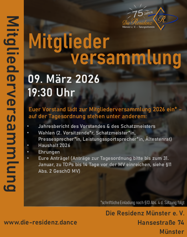 gerne möchten wir euch auf die nächste Mitgliederversammlung (MV) am 09. März 2025 um 19:30 Uhr aufmerksam machen. Eine offizielle Einladung mit Tagesordnung folgt, sodass die Möglichkeit besteht, Anträge zur Tagesordnung rechtzeitig einzureichen.