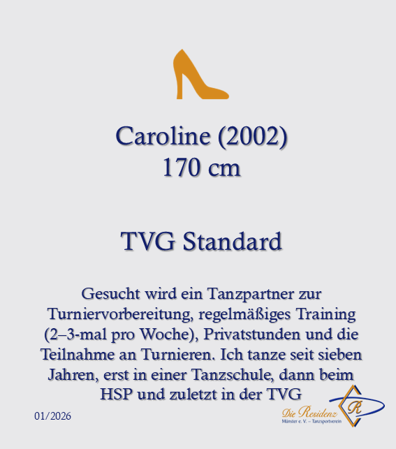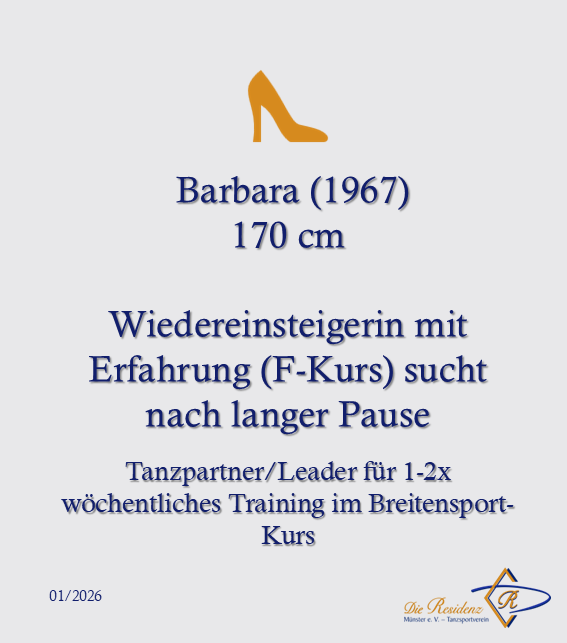 Damit dein Gesuch seinen Weg auf die Website findet, sende uns einfach eine Mail an kontakt@die-residenz.dance und teile uns deinen Name, deine Körpergröße, sowie das Niveau, für das Du einen Tanzpartner suchst, mit. Das Niveau kann zum Beispiel bedeuten: Breitensport, Turniervorbereitung Standard oder Latein oder auch eine bestimmte Turnierstartklasse, wenn du schon länger im Tanzsport aktiv bist. Bei Ambitionen gib gerne an, wie häufig du pro Woche trainieren möchtest.